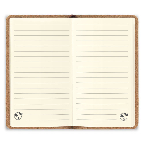 Caderno de bolso de capa dura em folha de bambu e cortiça. Contém 160 páginas, em papel 100% reciclado, pautadas cor de marfim, fita separadora, suporte para esferográfica (não inclusa) e elástico para fecho do caderno. 90 x 142 mm