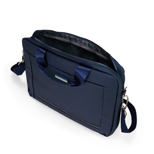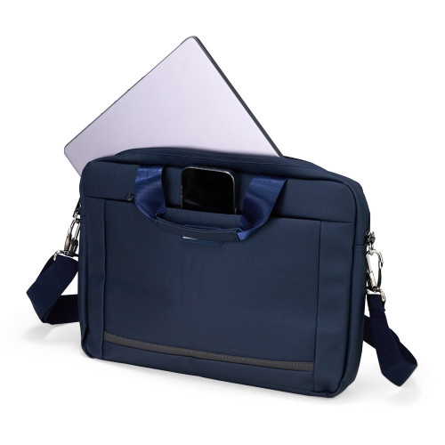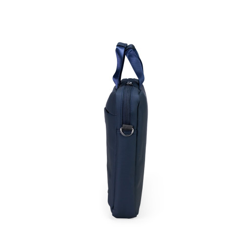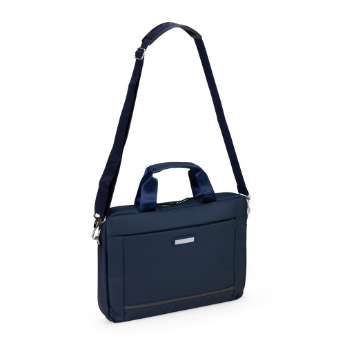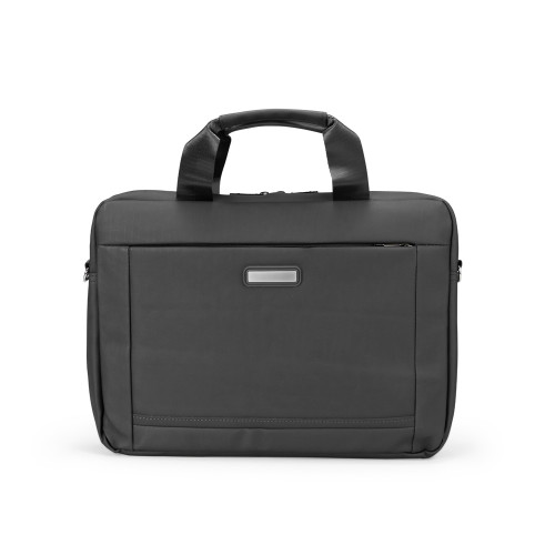 Descrição: Pasta para notebook confeccionada em couro sintético impermeável com fechamento em zíper e capacidade para aparelhos de até 15,6 polegadas. Possui dois compartimentos: o principal, com revestimento acolchoado, quatro bolsos abertos de tamanhos diferentes e duas divisórias para canetas; e o frontal, com plaquinha metálica fixa na parte externa. Conta ainda com duas alças de mão e um par de abas metálicas para alças removíveis. Acompanha alça de ombro ajustável.