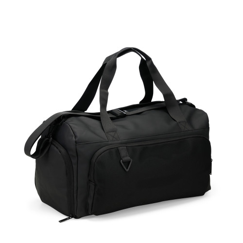 Descrição: Bolsa confeccionada em couro sintético com capacidade de até 32 litros. Apresenta compartimento interno com bolso de zíper e outros dois bolsos abertos. Conta ainda com cinco compartimentos externos em diferentes tamanhos, incluindo um lateral dedicado para tênis, um bolso menor com encaixe para malas e outro para itens molhados. Possui duas alças de mão e alça transversal removível.