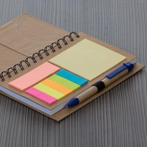 Descrição: Bloco de anotações ecológico com caneta e post-it. Bloco com dois suporte internos para cartão, possui cinco blocos auto-colantes com 20 folhas cada, bloco laranja e bloco amarelo com aproximadamente 20 folhas cada. Possui aproximadamente 70 folhas brancas pautadas e caneta de papelão de clip e ponteira plástica..