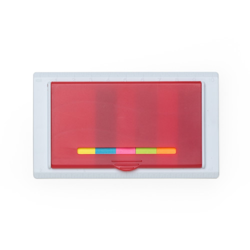Descrição: Kit post-it em plástico resistente, possui mini régua nas laterais maiores com as medidas em milímetro e polegada. Contém sete blocos auto-colantes com aproximadamente 25 folhinhas cada.