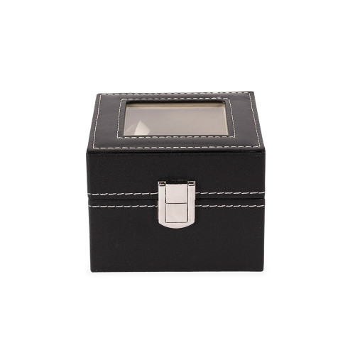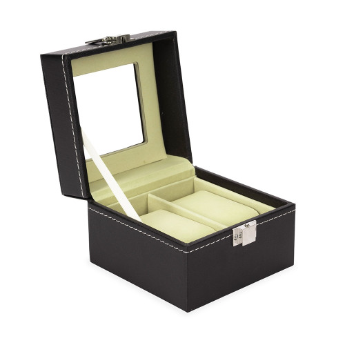 Descrição: Porta-relógios com acabamento em couro sintético à base de PVC. Com revestimento interno de veludo, possui duas divisórias com almofadas removíveis, tampa com visor de vidro e trava de segurança para o fechamento do estojo.