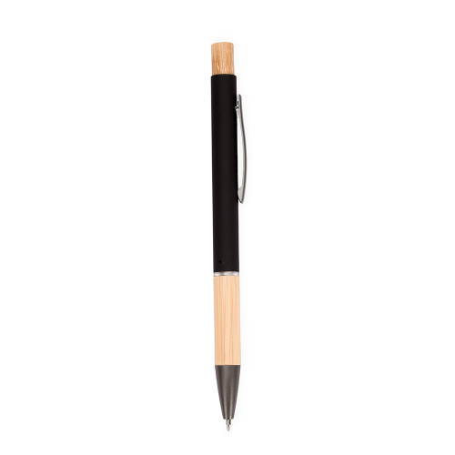Descrição: Caneta com carga esferográfica azul de 1.0mm. Apresenta corpo metálico, detalhes em bambu e acionamento por clique, oferecendo uma pegada leve para uma escrita precisa.