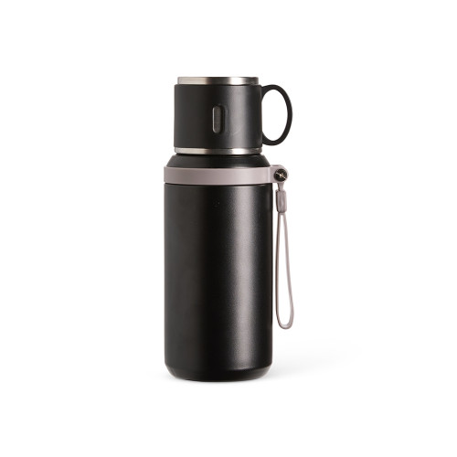 Descrição: Garrafa térmica em inox com pintura eletrostática e capacidade de até 600 ml. Possui estrutura de parede dupla e tampa interna rosqueável com anel de vedação, abertura do bocal por botão de acionamento e infusor. Conta ainda com tampa externa em formato de caneca e alça emborrachada para transporte.