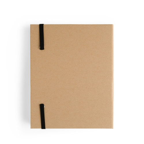 Descrição: Bloco de anotações com capa dura em kraft e fechamento por elástico. Possui aproximadamente 80 folhas de tonalidade marfim sem pautas e cinco canetas coloridas de ponta dupla: uma fina e outra tipo pincel.