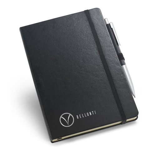 Kit de caderno A5 e esferográfica em cartão e alumínio. Caderno capa dura com 192 páginas lisas de cor marfim. Esferográfica de escrita a preto. Fornecidos em caixa almofadada. Caderno: 137 x 210 mm | Esferográfica: ø11 x 136 mm | Caixa: 190 x 240 x 30 mm