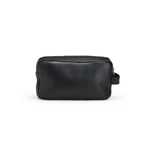 Descrição: Nécessaire em couro, com fechamento em zíper, alça lateral de mão e plaquinha presa a cordão de nylon.