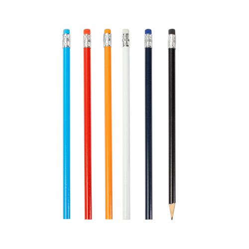 Descrição: Lápis sem ponta feito em madeira com grafite preto, guarnição em metal e borracha na extremidade oposta.