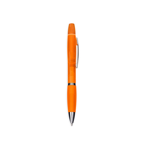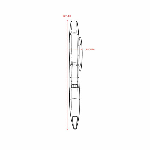Descrição: Caneta plástica com marca-texto e tampa protetora localizados no topo. Possui clip e ponteira em metal, acionamento por rotação e ponta esferográfica azul de 1.0mm.