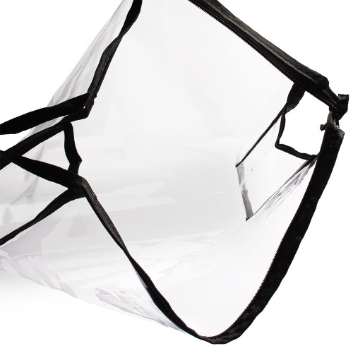 Descrição: Nécessaire em PVC transparente com fechamento em zíper e detalhes em nylon, incluindo uma pequena alça lateral.