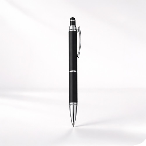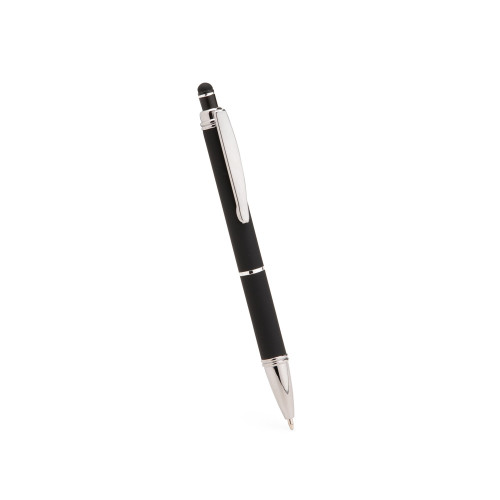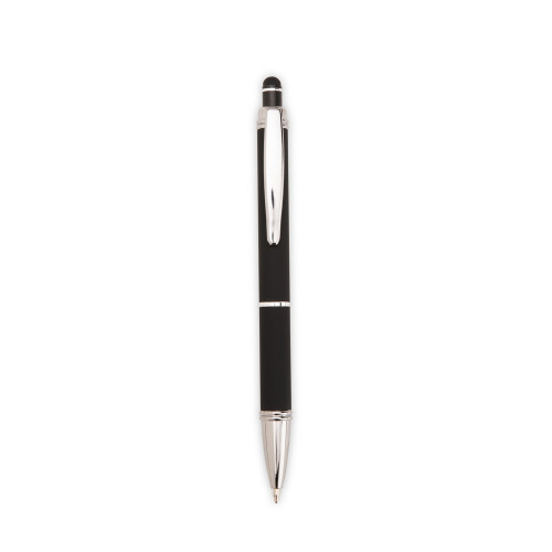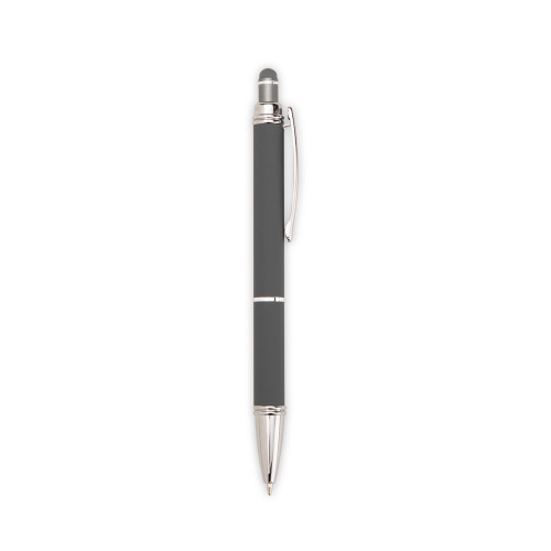 Descrição: Caneta metálica com pintura de acabamento emborrachado. Possui acionamento por clique, topo emborrachado para uso em dispositivos com telas sensíveis ao toque e carga esferográfica azul de 1,0 mm.