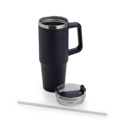 Descrição: Caneca térmica em inox 304 com pintura eletrostática e capacidade para até 900ml. Apresenta estrutura de parede dupla e vedação a vácuo, o que permite a conservação da temperatura de líquidos por mais tempo. Dispõe ainda de tampa rosqueável em plástico com acesso para canudo e trava giratória. Acompanha canudo plástico.