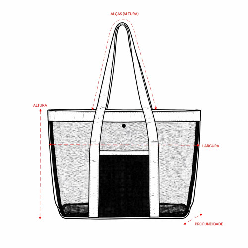 Descrição: Bolsa confeccionada em tela de PVC com botão de fechamento em plástico, alças e detalhes em tecido sintético.