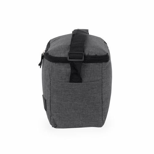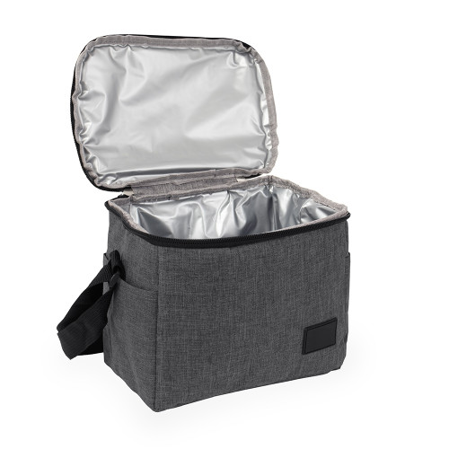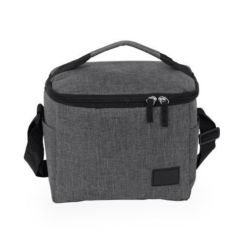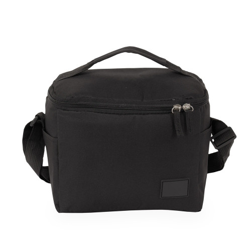 Descrição: Bolsa térmica confeccionada em Oxford 300D resistente à água com capacidade máxima de 6 litros, fechamento em zíper e plaquinha personalizável em plástico costurada na parte frontal. Possui revestimento térmico antivazamento em PEVA, dois bolsos laterais, alça de mão superior e alça transversal ajustável.