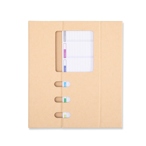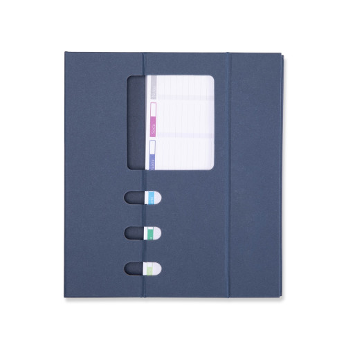 Descrição: Bloco de notas com capa e estrutura em papelão, aproximadamente 98 folhas para anotações semanais e fechamento magnético, que permite montar porta-canetas e suporte para celular enquanto permanece aberto.