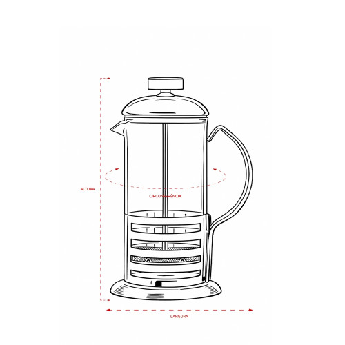 Descrição: Cafeteira tipo prensa francesa com capacidade para até 350ml. Feita em vidro com detalhes e alça em inox, além de tampa com êmbolo e tela em inox.