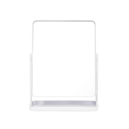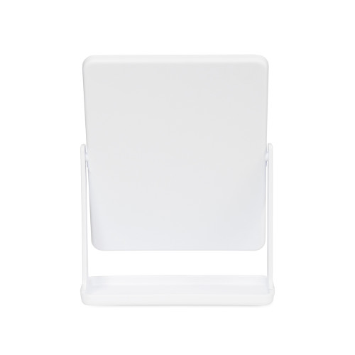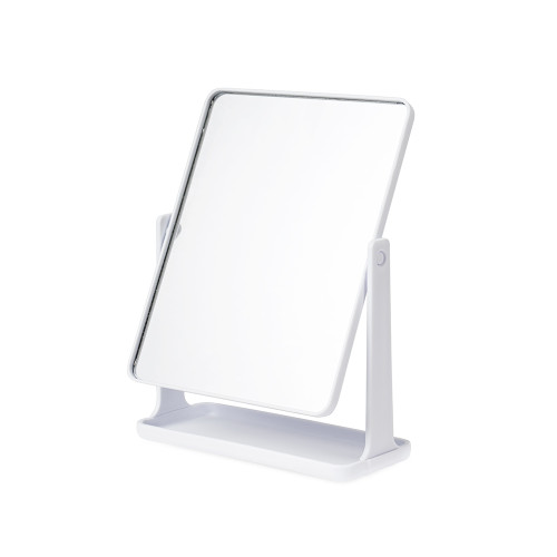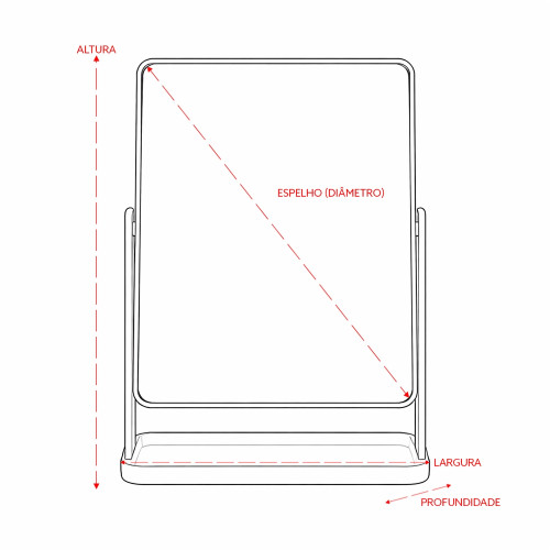 Descrição: Espelho de mesa giratório retangular sem aumento. Possui estrutura em plástico e base com espaço para organizar pequenos objetos.