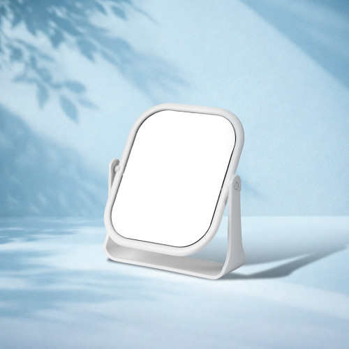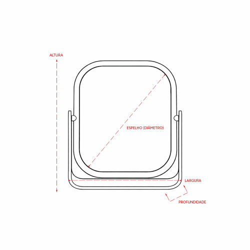 Descrição: Espelho de mesa dupla face, sem aumento, com moldura e base em plástico.