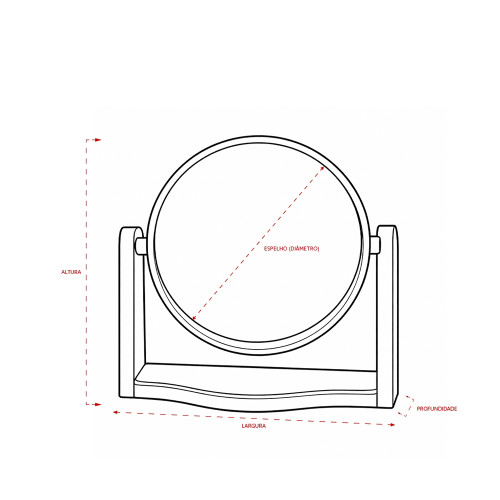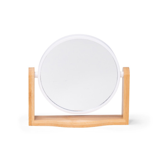 Descrição: Espelho giratório com base em bambu e moldura em plástico.