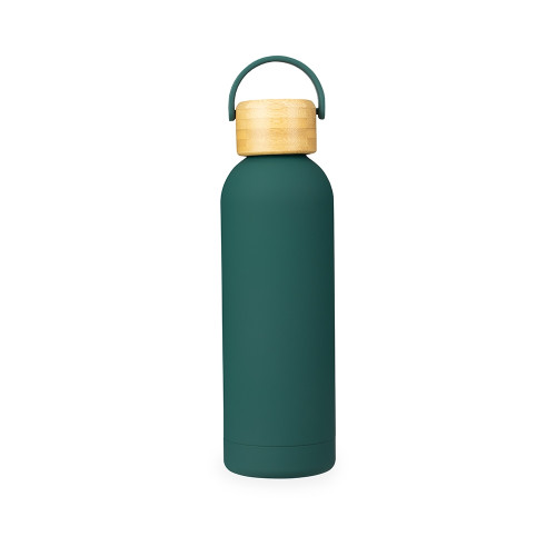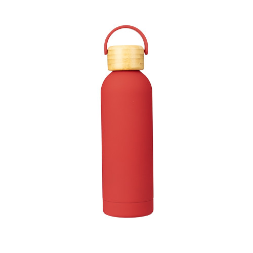 Descrição: Garrafa térmica em inox com pintura emborrachada e capacidade para até 500ml. Possui estrutura de parede dupla e vedação a vácuo que permite conservar a temperatura de bebidas por mais tempo, além de tampa rosqueável em bambu com alça plástica para transporte.