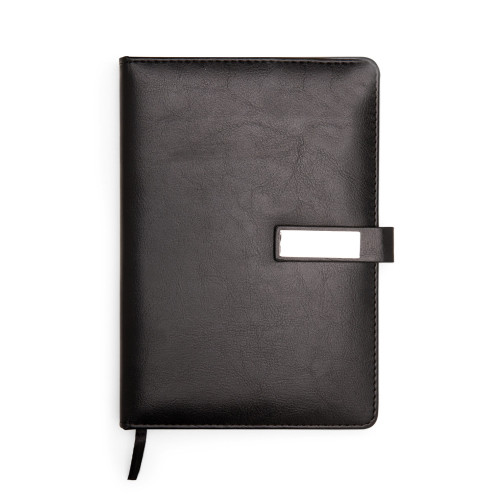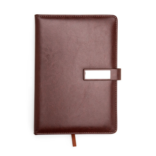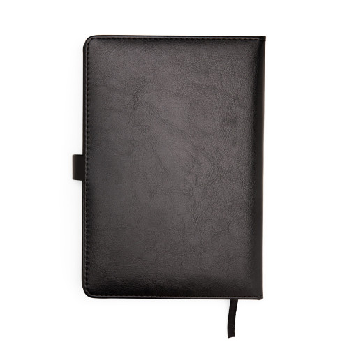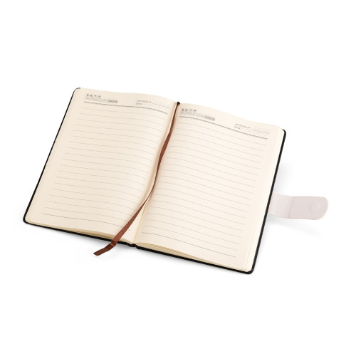 Descrição: Caderneta com capa em couro sintético, fecho magnético, além de marca-páginas em fita de cetim. Possui aproximadamente 96 folhas marfim com pauta. Acompanha plaquinha fixa em metal.