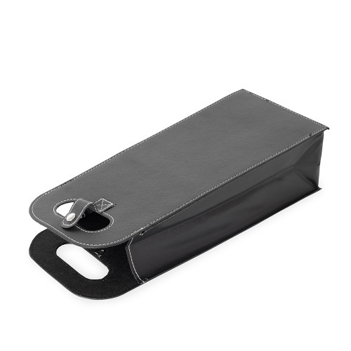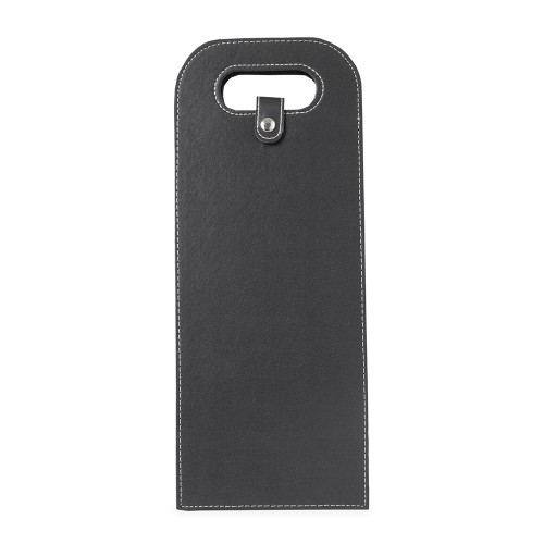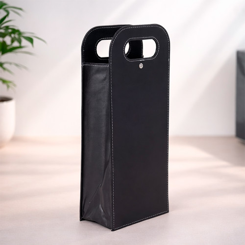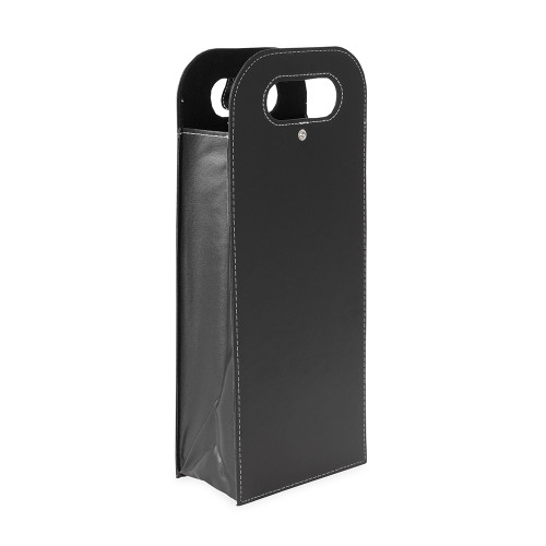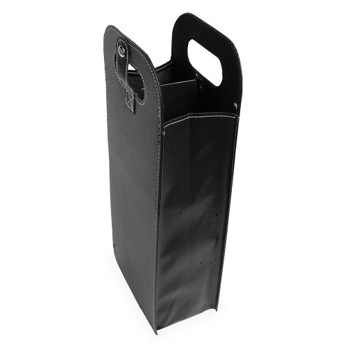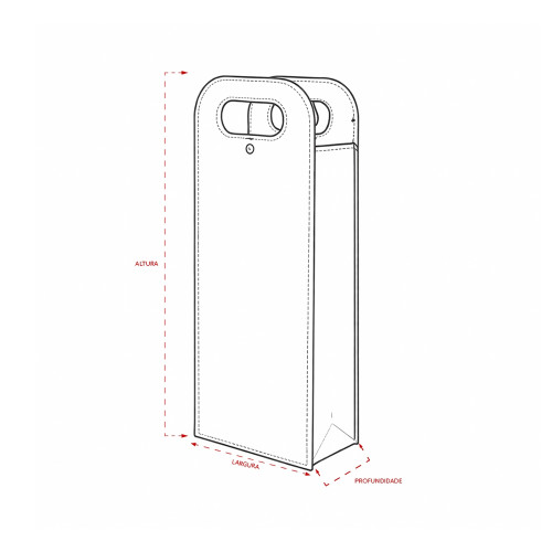 Descrição: Porta-vinhos duplo em couro sintético com estrutura interna em papelão. Possui alça de mão vazada, fechamento em botão metálico e divisória removível em papelão.