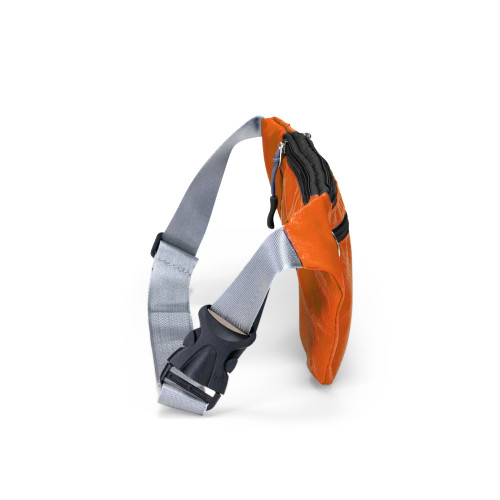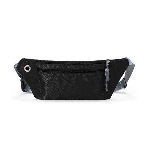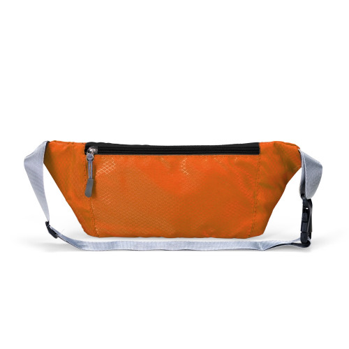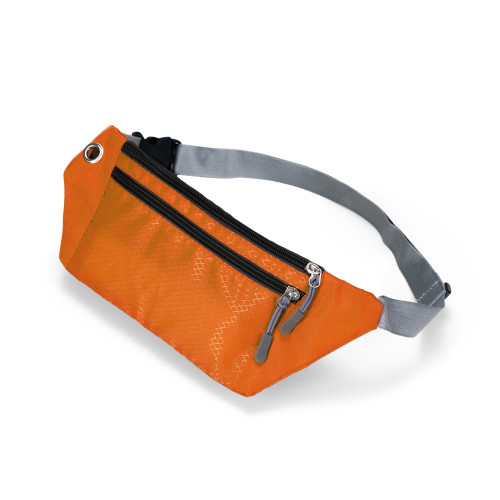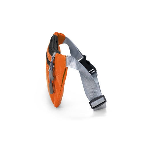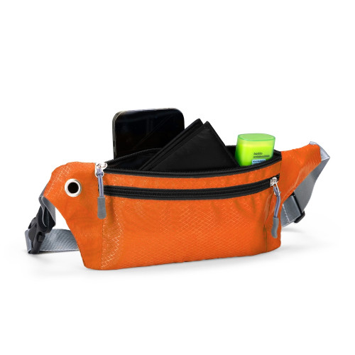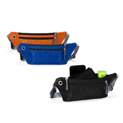 Descrição: Pochete esportiva confeccionada em poliéster filamentado resistente à água. Possui cinto ajustável com fivela plástica de encaixe, saída para fones de ouvido e três compartimentos com fechamento em zíper, sendo dois na parte frontal e um traseiro antifurto.