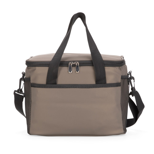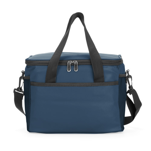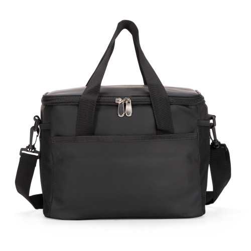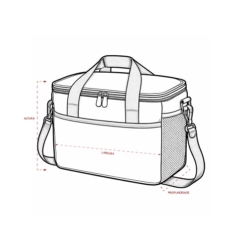 Descrição: Bolsa térmica confeccionada em couro sintético a partir do PVC impermeável, com capacidade máxima de 12 Litros e revestimento interno em filme de alumínio, que mantém a temperatura de alimentos e bebidas por mais tempo. Possui alças de mão costuradas em poliéster, além de um par de argolas plásticas para engate de alça e três bolsos externos abertos, sendo dois em tela de malha com elástico. Acompanha alça transversal ajustável.