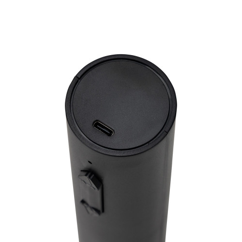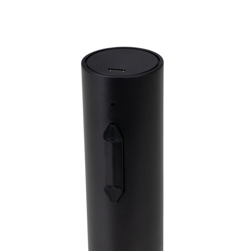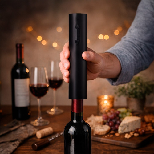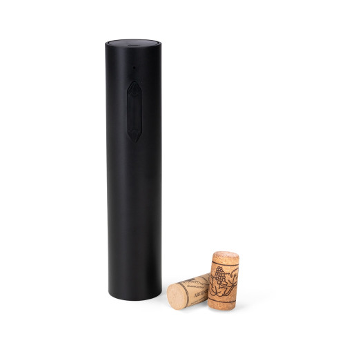Descrição: Saca-rolhas elétrico recarregável com estrutura em plástico ABS, policarbonato (PC) e broca em aço carbono. Conta com botões em formato de diamante para controle do aparelho e acompanha cabo USB-C para carregamento.