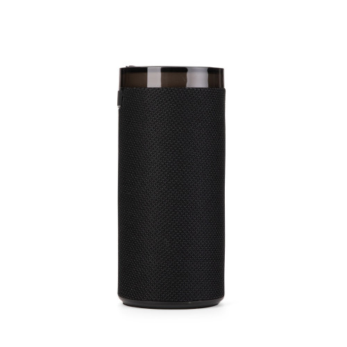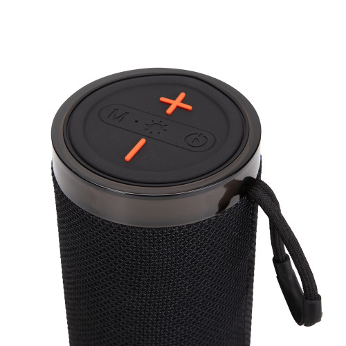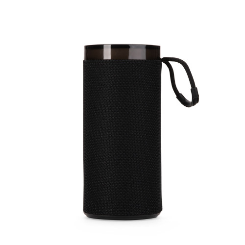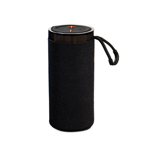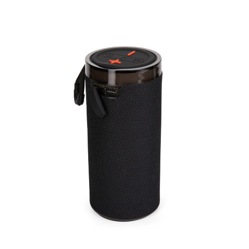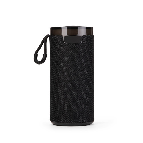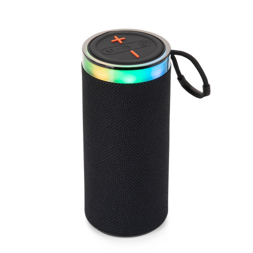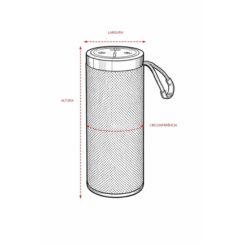 Descrição: Caixa de som multimídia com estrutura em plástico ABS, revestimento em malha de poliéster, base antiderrapante e alça em nylon com proteção emborrachada, painel de botões superior em silicone e iluminação RGB ajustável. Possui conexão Bluetooth 5.3, rádio FM e tecnologia TWS, que permite sincronizar duas caixas simultaneamente. Conta ainda com entradas USB-A e TF para reprodução de arquivos MP3 via pen drives e cartões microSD, além de conexão USB-C para recarga. Acompanha cabo USB-C.