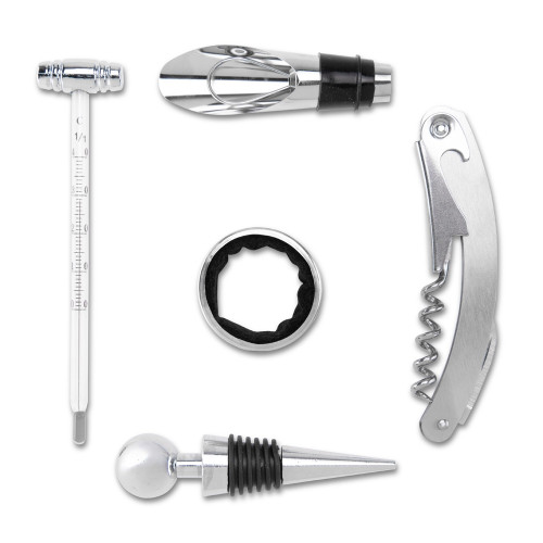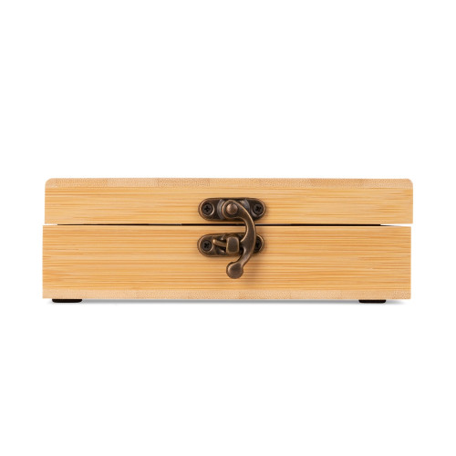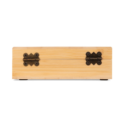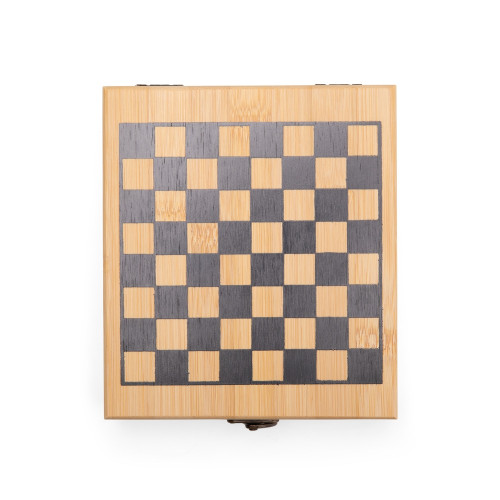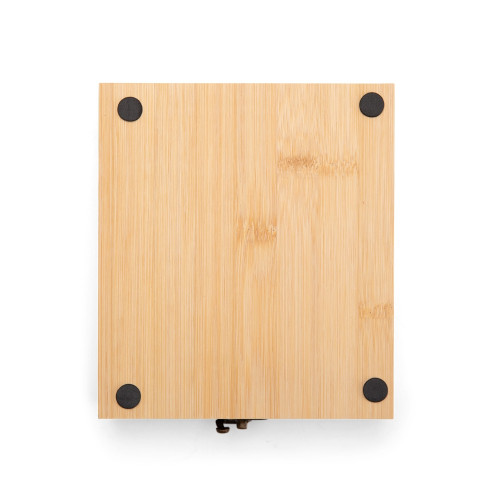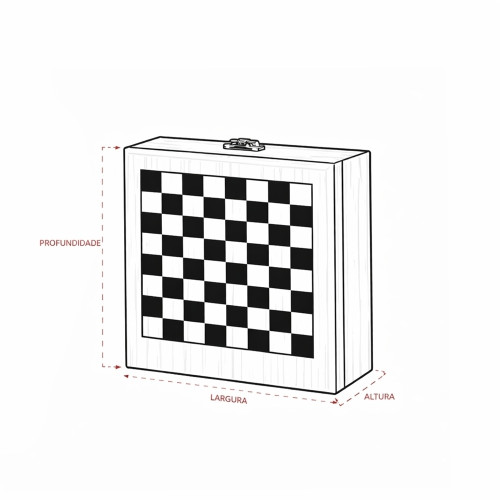 Descrição: Kit vinho composto por 4 itens: saca-rolhas de um estágio em inox 201, termômetro em vidro com detalhes em liga de zinco, anel corta-gotas (wine collar) em liga de zinco e feltro, além de tampa de bico em zinco com detalhe em silicone. O conjunto é acondicionado em um estojo feito em MDF, com revestimento interno em espuma de EVA, dobradiças e fecho giratório em metal. Possui acabamento em formato de tabuleiro de xadrez na tampa, acompanhado de 32 peças confeccionadas em bambu.