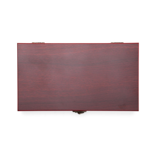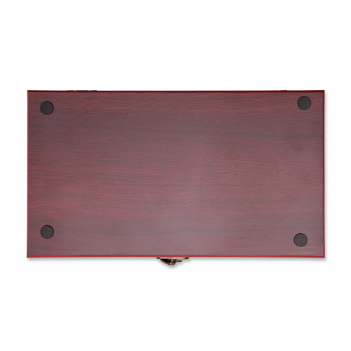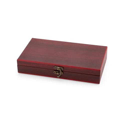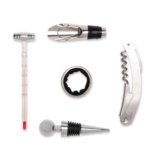Descrição: Kit vinho composto por 5 itens: saca-rolhas de um estágio em inox 201, termômetro em vidro com detalhes em liga de zinco, anel corta-gotas (wine collar) em liga de zinco e feltro, além de bico dosador e tampa de bico, ambos em liga de zinco com revestimento em silicone. Acompanha estojo feito em MDF com revestimento interno em espuma de EVA, dobradiças e fecho giratório em metal.