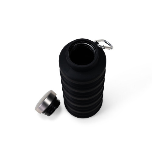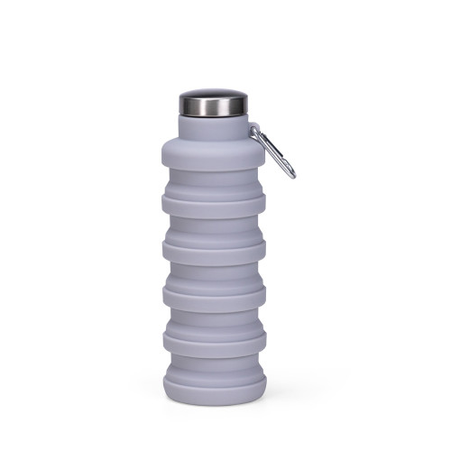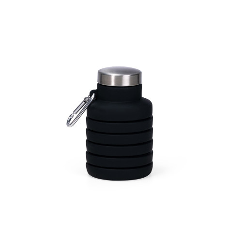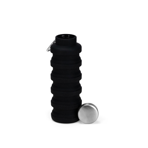 Descrição: Garrafa retrátil com capacidade máxima de 500ml, podendo alcançar a capacidade de até 200ml quando retraída. Apresenta estrutura flexível em silicone, livre de BPA e é compatível com lava-louças. Conta com alça lateral para fixação de chaveiro e tampa rosqueável em inox e polipropileno (PP). Acompanha mosquetão em liga de alumínio.
