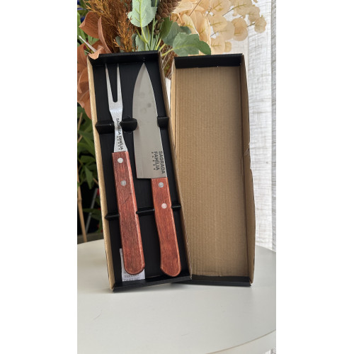 Descrição: Kit churrasco duas peças em estojo de papel kraft com elásticos de nylon para fixação dos talheres, contém faca e garfo.