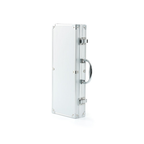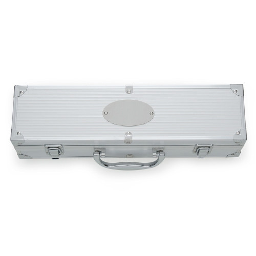 Descrição: Kit churrasco 5 peças em maleta de alumínio com travas de segurança, contém três facas de corte, tesoura e chaira. Parte interna da maleta com revestimento em tnt e suportes de velcro para fixação das peças.