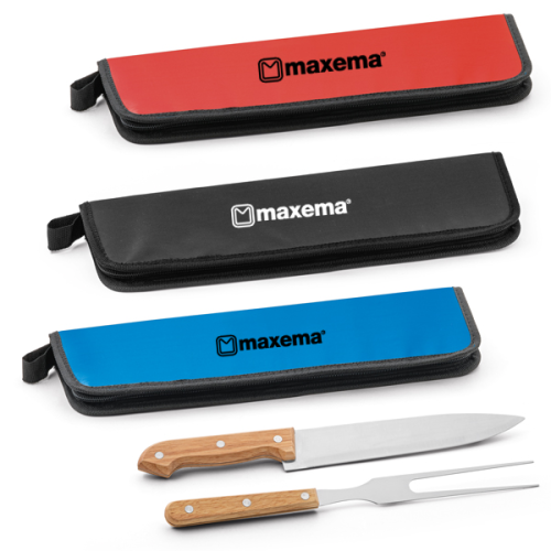 Kit churrasco. Aço inox e madeira. 2 peças em estojo de 210D. Food grade. Estojo: 350 x 130 x 20 mm