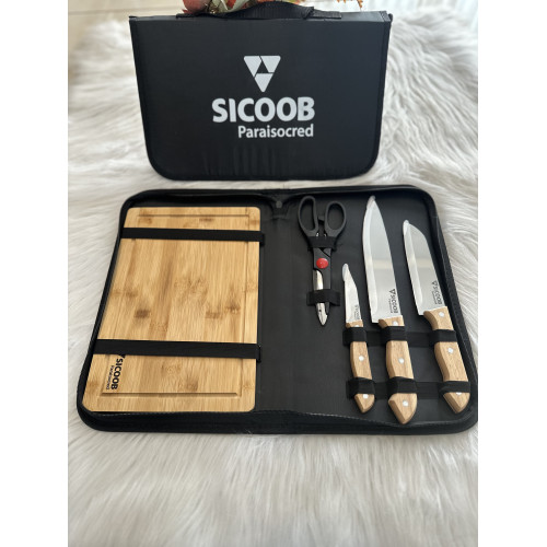Descrição: Kit churrasco 5 peças em estojo de nylon com alça e parte interna com elástico para fixar as peças. Possui tábua de madeira com canaleta, três facas de corte e tesoura.