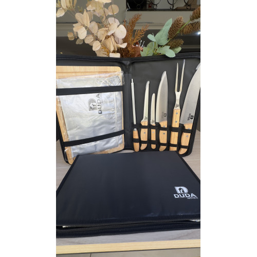 Descrição: Kit para Churrasco 8 peças com cabo em Bambu, laminas em aço Inox e avental. Acompanha tábua em bambu com canaleta, 3 facas de corte e uma faca de serra cabo, chaira, garfo, e avental com bolso na cor prata. Acomodados em uma maleta em nylon preta, costura com zíper . Rebites em Aço Inox, um dos mais resistentes à ferrugem e corrosão.