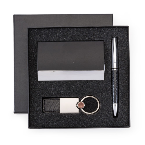 Descrição: Kit executivo com 3 peças em estojo preto de papelão revestido com espuma interna. Possui: caneta metal brilhante com detalhe couro sintético preto, clip metal e anel central preto(aciona por giro); porta cartão em couro sintético liso com detalhes metálicos brilhantes(parte interna com veludo) fecha por imã; chaveiro metal fosco com detalhe inferior emborrachado(suporte da argola giratório brilhante).