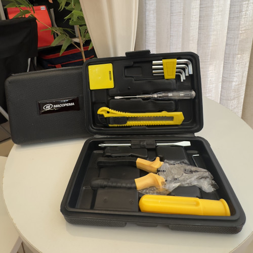 O kit contém 11 ferramentas indispensáveis para o seu cotidiano e possui um estilo moderno e compacto, com um espaço retangular no meio que pode ser personalizado com a sua marca. Além disso, o estojo tem textura que evita escorregar e uma trava superior que protege as ferramentas.