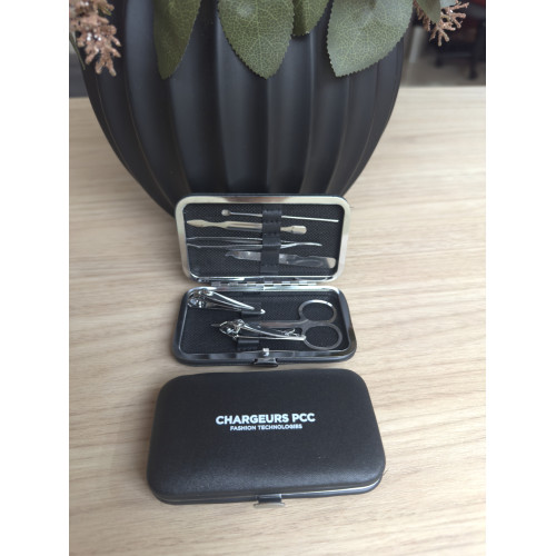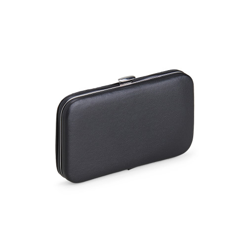 Descrição: Kit manicure 7 peças em estojo de couro sintético. Possui: dois cortadores de unhas, tesoura, lixa, pinça, empurrador de cutícula e palito de unha. Parte interna de TNT com suporte de couro sintético para fixar as peças. Para abrir o estojo basta apertar o botão central.