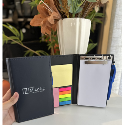 Descrição: Kit para anotações em couro sintético com autoadesivos e caneta plástica. Contém 3 blocos com aproximadamente 50 folhas, conjunto de 5 marcadores plásticos autoadesivos com aproximadamente 25 folhas e caneta plástica touchscreen com carga esferográfica azul 1.0mm e acionamento por rotação.