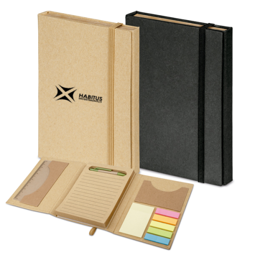 Kit para escritório. Cartão com caderno (80 folhas pautadas em papel reciclado), 6 blocos adesivados (25 folhas cada), 1 régua de 12 cm, 1 esferográfica em papel kraft e suporte para cartões de visita. 110 x 153 mm