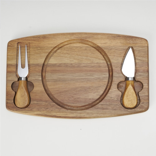Descrição: Kit queijo 3 peças, contém: tábua de madeira com canaleta, faca com ponta, e garfo. Tábua com imã para encaixe e fixação dos utensílios.