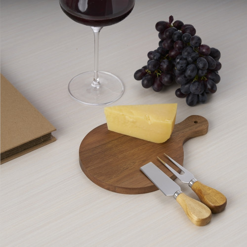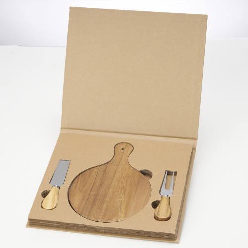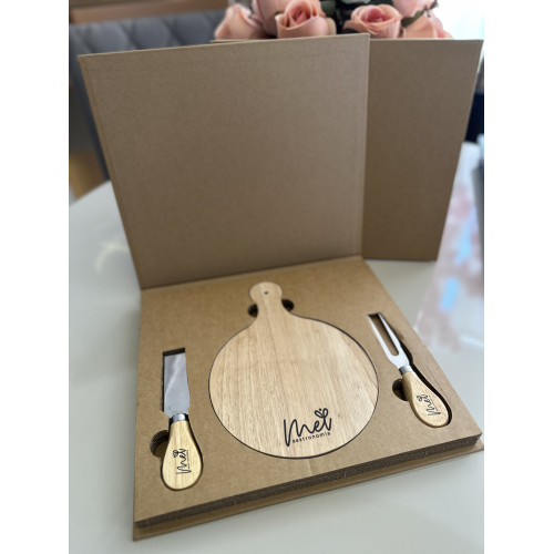 Descrição: Kit queijo 3 peças em estojo kraft, contém: tábua de madeira redonda, faca reta, e garfo. Tábua com orifício para encaixe.