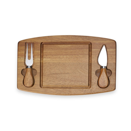 Descrição: Kit queijo 3 peças, contém: tábua de madeira com canaleta, faca com ponta, e garfo. Tábua com imã para encaixe e fixação dos utensílios.