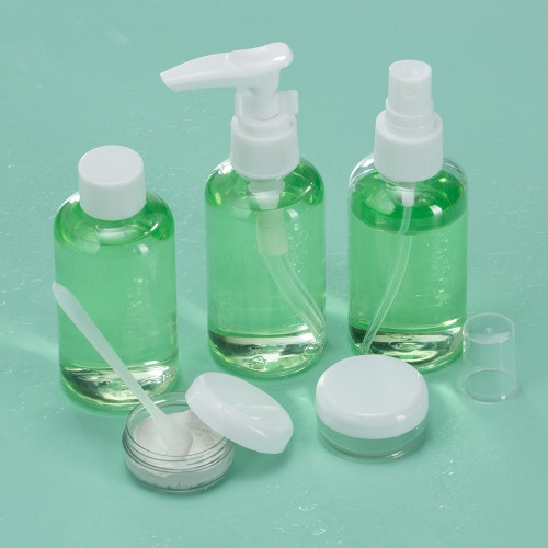 Descrição: Kit viagem 6 peças em estojo ziplock. Contém frasco de 80ml com tampa spray; frasco de 80 ml com tampa rosqueável; frasco de 80 ml com tampa pump; 2 potes de 10 ml com tampa rosqueável e mini espátula fosca. Frascos plásticos e estojo em pvc com puxador plástico.