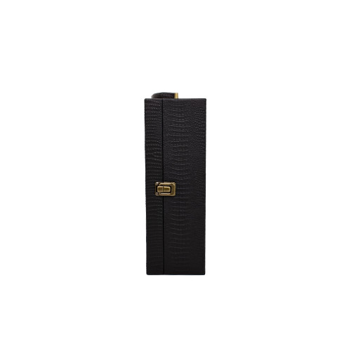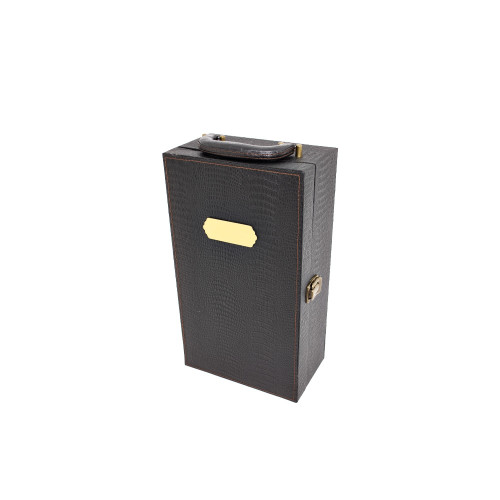 Descrição: Kit vinho 4 peças em maleta de couro sintético texturizada. Contém saca-rolhas metálico, bico condutor com tampa, cortador de lacre e wine collar. Maleta com alça, trava de segurança e plaquinha metálica fixa. Área interna revestida de veludo com suportes de nylon com velcro e duas repartições para garrafas.