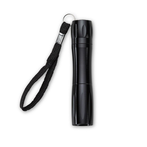 Descrição: Lanterna de alumínio com alça. Possui um led acionado através do botão emborrachado e alça para transporte em nylon. Compartimento do botão desrosqueável para inserção de uma unidade de pilha AA(não inclusa).