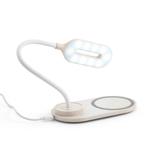 Luminária de mesa em ABS e fibra de palha de trigo com carregador wireless. A haste é flexível para ajustar a direção da luz e contém 20 LEDs que permitem uma iluminação até 3 níveis de intensidade. No topo da luminária encontra-se um botão touch para ligar, desligar e ajustar os níveis de iluminação. O carregador sem fios é de carregamento rápido, tendo uma potência até 10W, com entradas 5V/2A e 9V/1.67A. No local onde o equipamento é colocado tem um círculo com silicone para evitar que se mova. Incluso cabo micro USB de 1 m. Fornecido em caixa de papel kraft. 160 x 268 x 85 mm